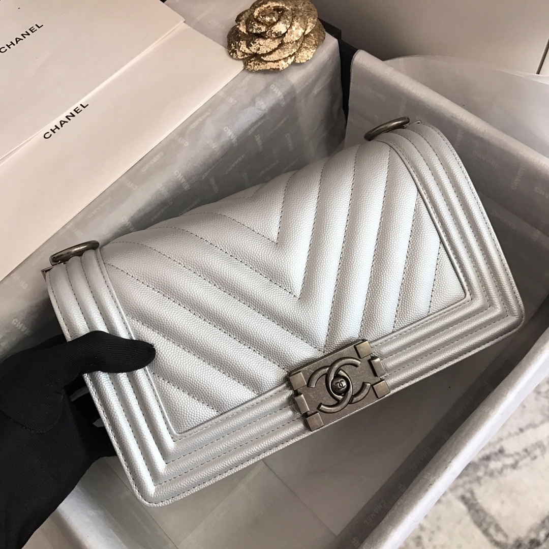 Ch**el medium boy bag classic gold-tone metal grained leather white a67086 25cm