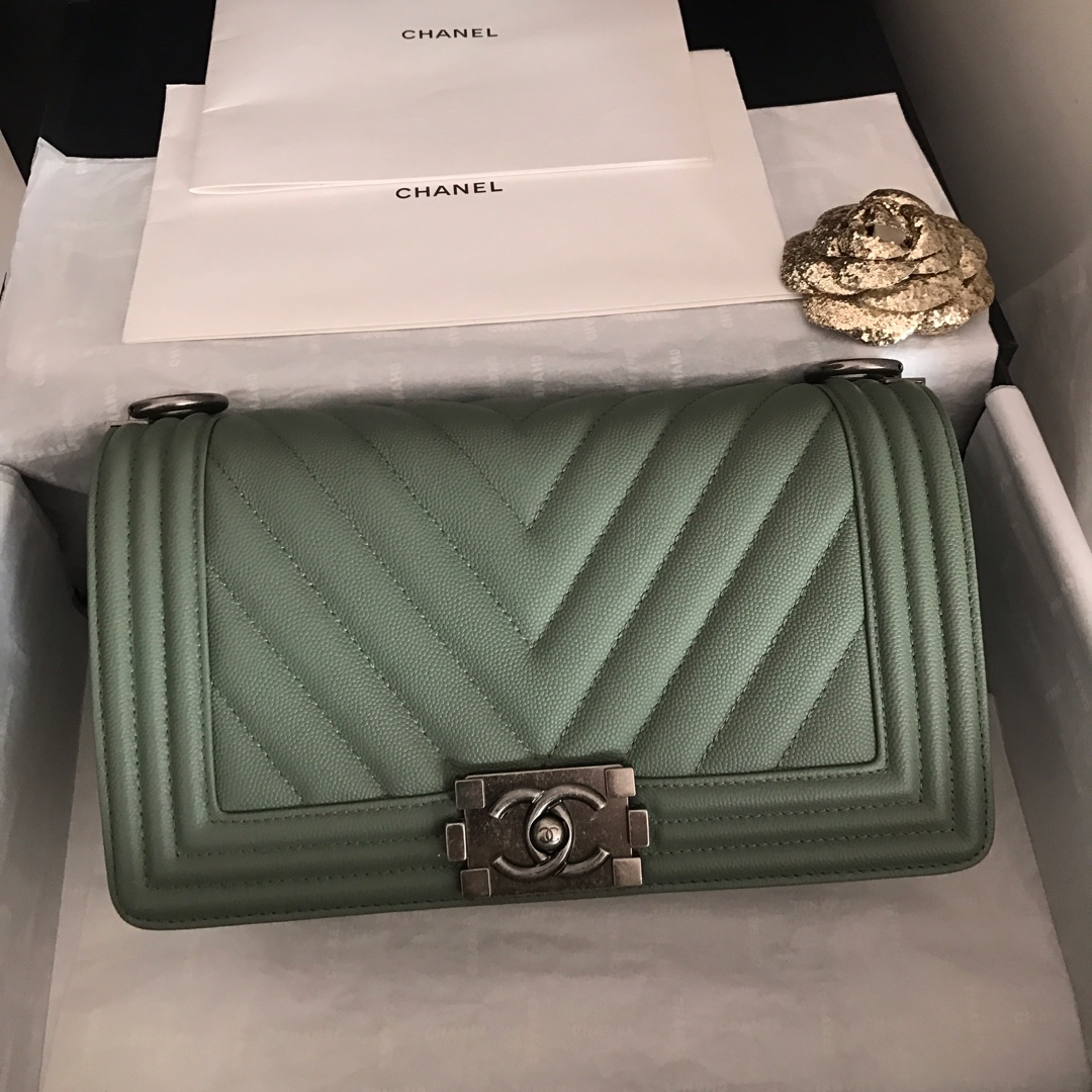 Ch**el medium boy bag classic gold-tone metal grained leather green a67086 25cm