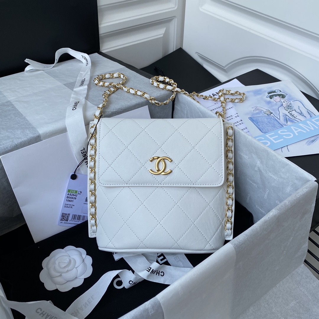 Ch**el small hobo bag calfskin & gold-tone metal white as2542 19 x 23 x 7 cm