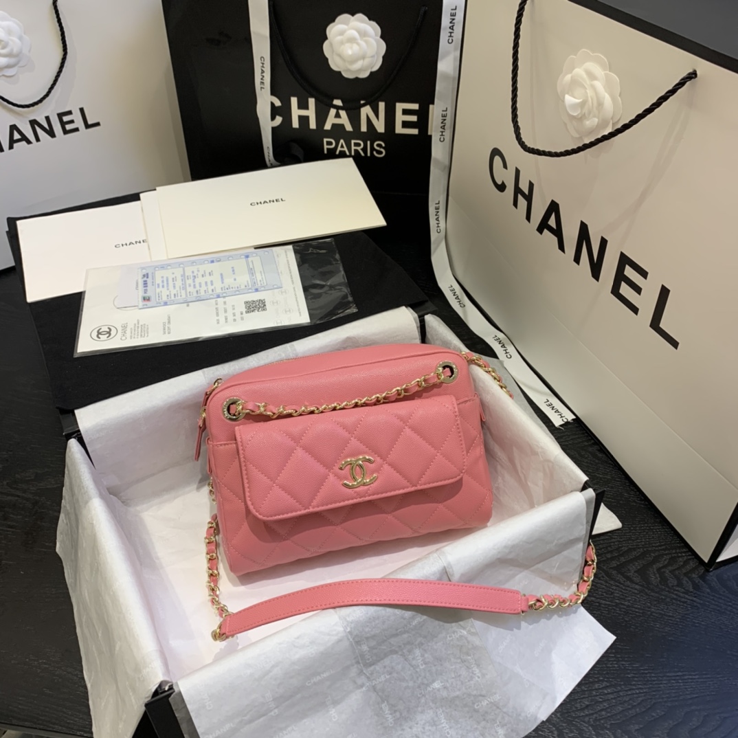 Ch**el camera case with extra clutch grained leather pink as1367 22 x 15 x 6 cm