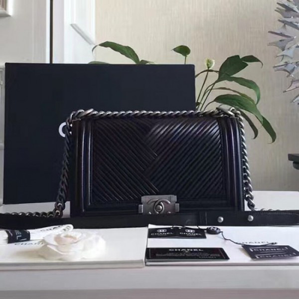 Ch**el medium boy bag chevron black-tone metal grained leather blue a67086 25cm