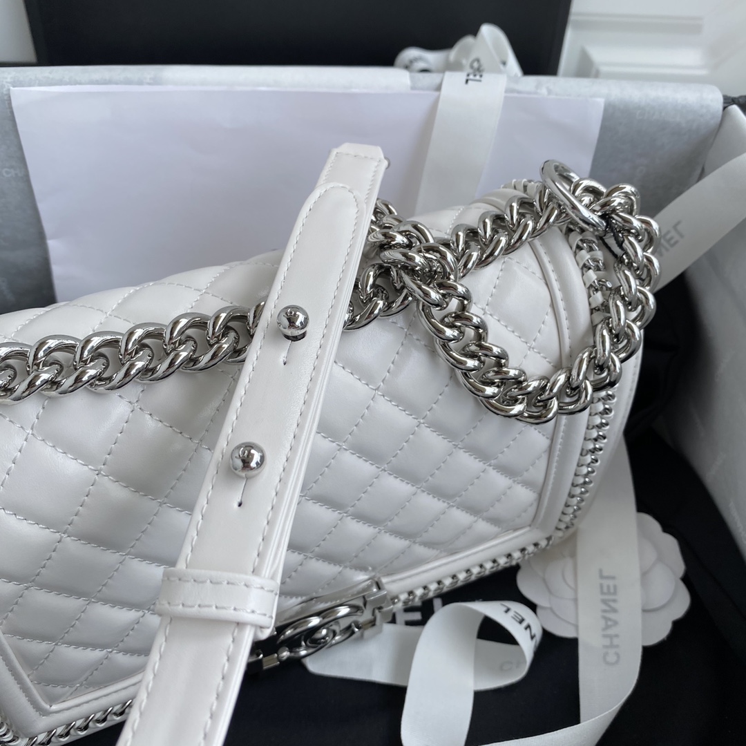 Ch**el medium old metallic chevron quilted boy flap bag white a67086 25 × 15 × 7.5 cm