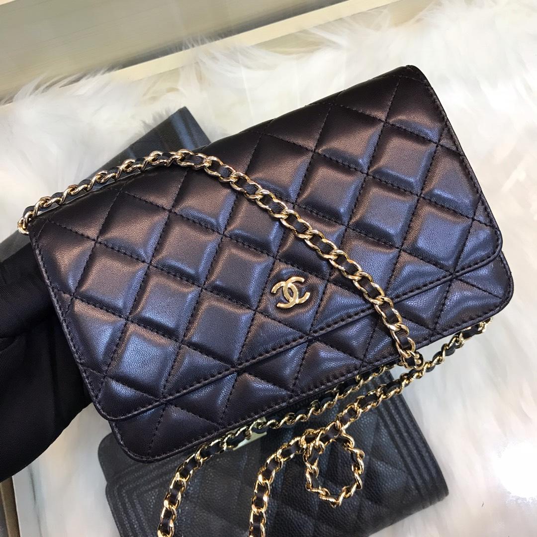 Ch**el small vanity case lambskin and gold metal black as2630 15 x 10 x 11 cm