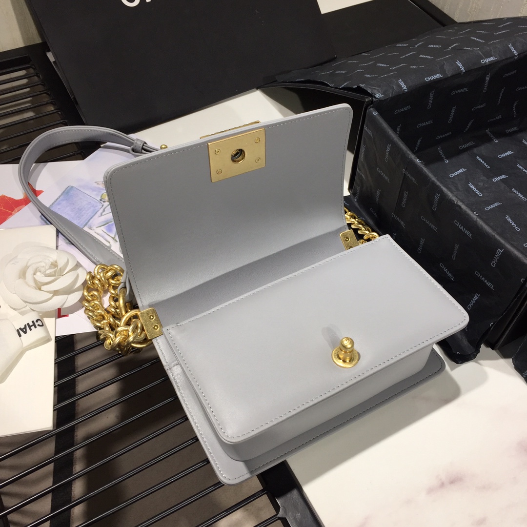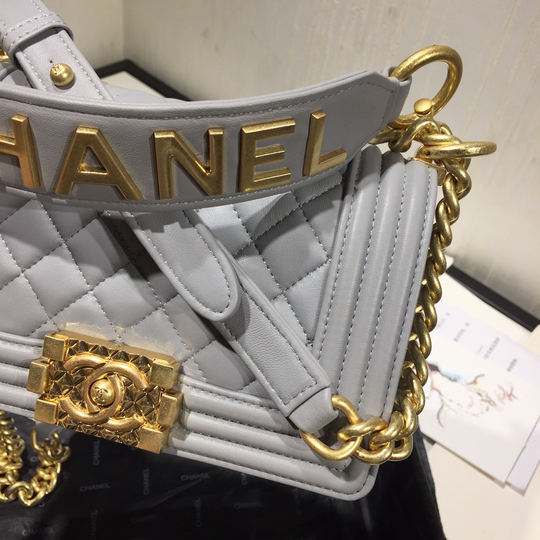 Ch**el medium boy bag chevron gold-tone metal grained leather dark gray a67086 25cm